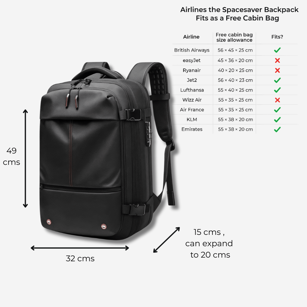 The Spacesaver Travel Bag is your ultimate travel companion. With its innovative vacuum compression system, you can pack up to 50% more, ensuring you have everything you need without the bulk. Stay organised with dedicated compartments for your tech, clothes, and wet/dry items. Travel confidently knowing your belongings are secure with the built-in anti-theft lock. Whether you're heading on a weekend getaway or an extended adventure, the Spacesaver Backpack adapts to your needs, making every journey smoother.